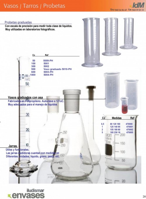- Probetas graduadas . Con escala de precisión para medir toda clase de líquidos. Muy utilizadas en laboratorios fotográficos. Vasos graduados con asa . Fabricados en Polipropileno. Autoclave a 121oC. Muy adecuados para el manejo de líquidos. Jarras. Útiles y funcionales. Las jarras medidoras cuentan con medidas en Diferentes unidades, líquido, grano, pasta, etc.