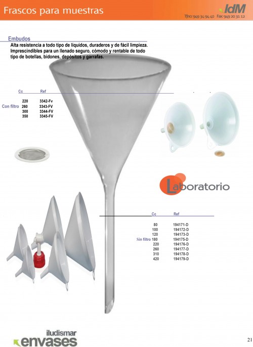 - Embudos . Alta resistencia a todo tipo de líquidos, duraderos y de fácil limpieza. Imprescindibles para un llenado seguro, cómodo y rentable de todo tipo de botellas, bidones, depósitos y garrafas.