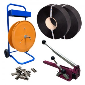 Todo el equipamiento necesario para flejar con fleje de plástico polipropileno en un único kit.