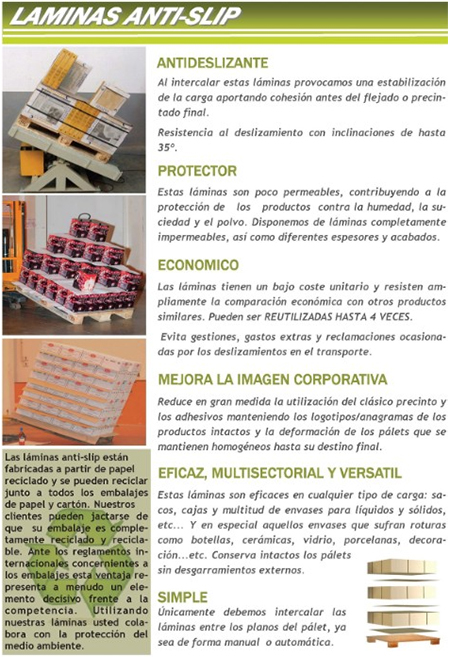 Las “Láminas Anti Eslip” son láminas de papel antideslizante. Estas láminas se colocan entre las diferentes capas ó pisos de cajas dentro del palet.