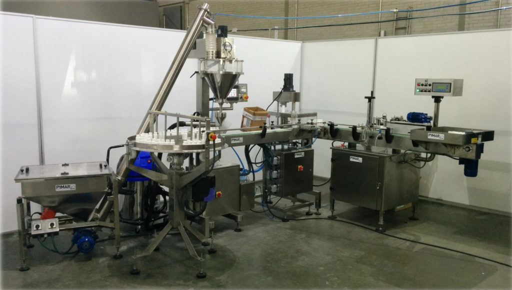 Línea completa de dosificado, taponado y etiquetado de polvos químicos, incluyendo sistema de aspiración, pulmón de entrada y mesa de recogida.
