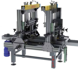 La colocación se realiza uno a uno, estando dotada la máquina de un almacén vertical de listones que alimenta a las grapadoras y un sistema de posicionado de la caja para la colocación del listón encima de los testeros.