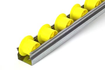 Minicarril P=50 Aleta (Amarilla). Compuesto por un perfil de chapa galvanizada y perforada de 0,8 mm de espesor, con roldanas de polipropileno (polietileno en caso de -30ºC) inyectado y montado en varilla de acero pulido de diámetro 3 mm. Con un corte preciso de ± 1 mm, el material se servirá siempre cortado y montado a la longitud indicada por el cliente.