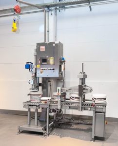 Envasadora con diseño ATEX fabricada en acero inoxidable y rodillo de tapa para el llenado automático de cubos y bidones de 2,5 a 60 Kg. con control de flujo de producto.