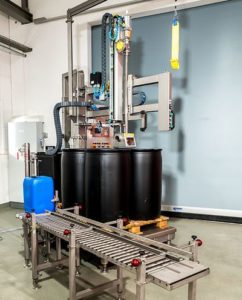 Envasadora móvil con diseño ATEX, fabricada en acero inoxidable, para el llenado semiautomático de latas, botes, IBC y bidones sobre palets.