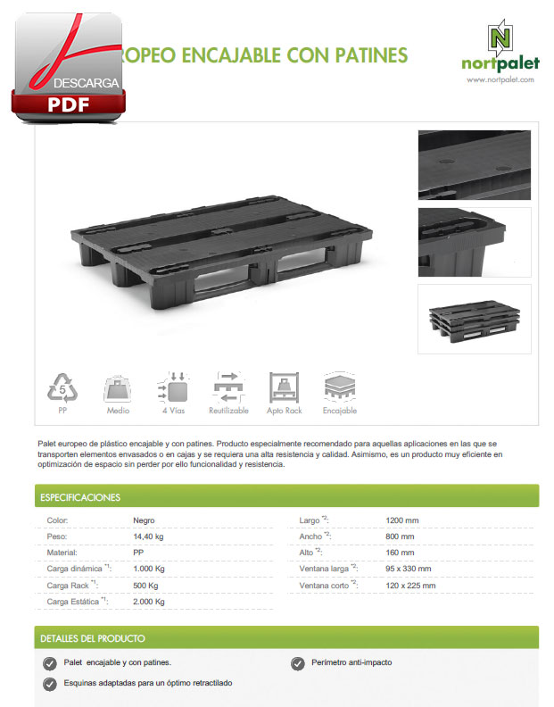 Palet encajable, especialmente recomendado para aquellas aplicaciones en las que se transporten elementos envasados o en cajas y se requiera una alta resistencia y calidad. Asimismo, el palet encajable es muy eficiente en optimización de espacio sin perder por ello funcionalidad y resistencia.