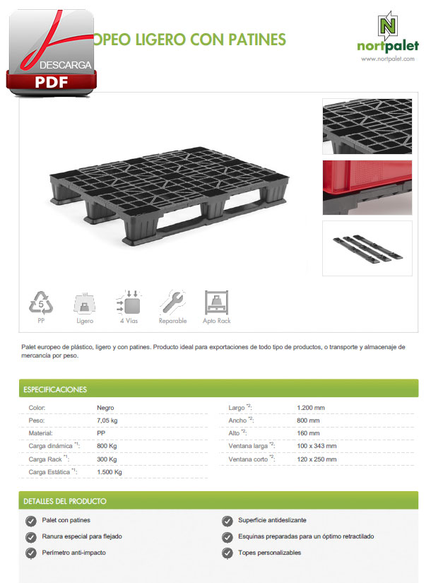 Palet europeo de plástico, ligero y con patines. Producto ideal para exportaciones de todo tipo de productos, o transporte y almacenaje de mercancía por peso.
