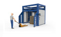 La máquina está equipada con un manipulador, aletas de centralizado, y un collar que permite la colocación del producto en el lugar correcto. La pantalla táctil permite operar el equipo fácilmente, seleccionando el tipo de patrón (por ejemplo. 5 sacos de 25kg por capa en un palet de 1,2 m x 1m), así como el número de sacos por palet. Este modelo también puede ampliarse opcionalmente con dispensadores de palet, rodillos transportadores para palets terminados, y más.