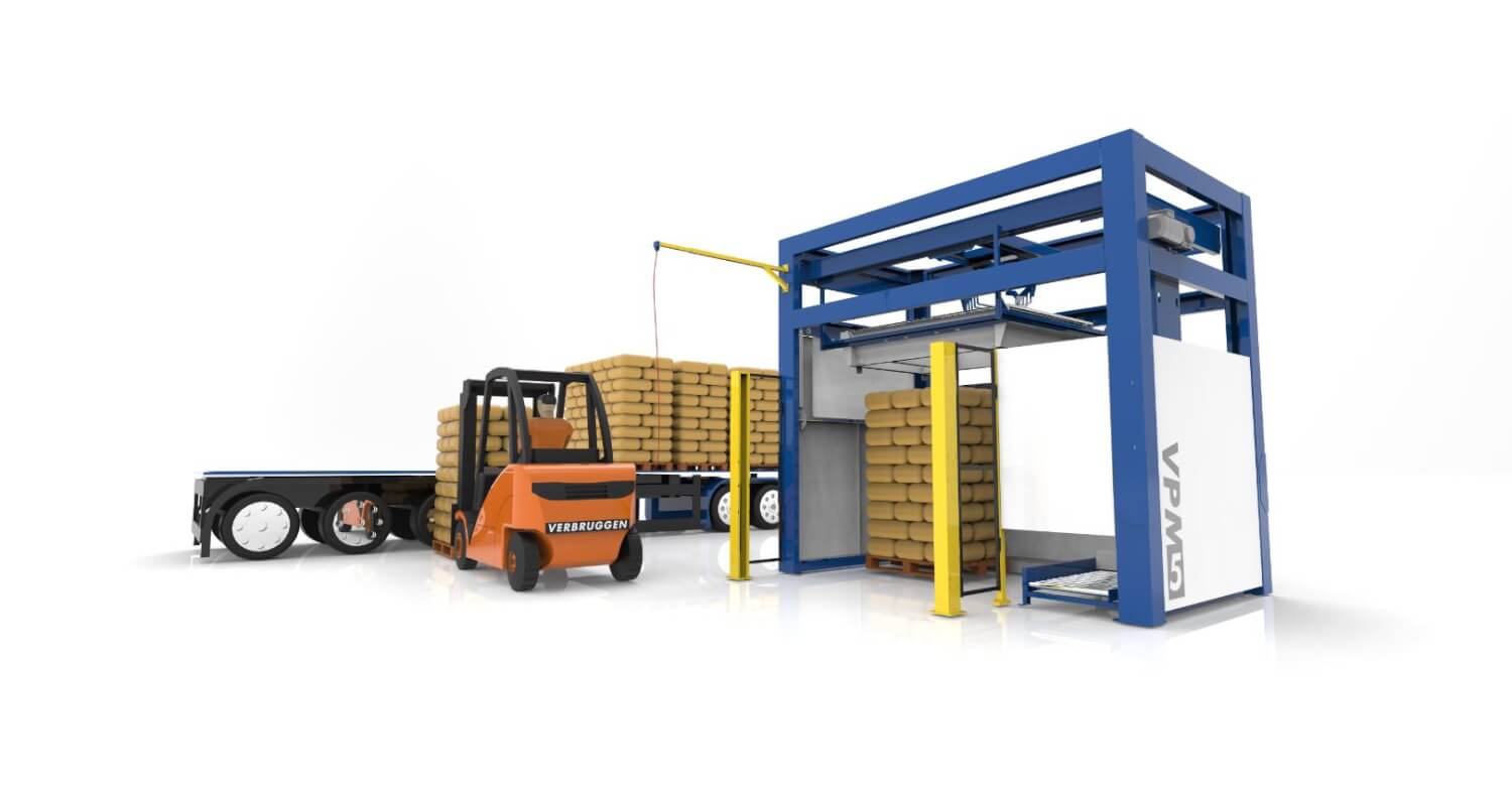 La máquina está equipada con un manipulador, aletas de centralizado, y un collar que permite la colocación del producto en el lugar correcto. La pantalla táctil permite operar el equipo fácilmente, seleccionando el tipo de patrón (por ejemplo. 5 sacos de 25kg por capa en un palet de 1,2 m x 1m), así como el número de sacos por palet. Este modelo también puede ampliarse opcionalmente con dispensadores de palet, rodillos transportadores para palets terminados, y más.