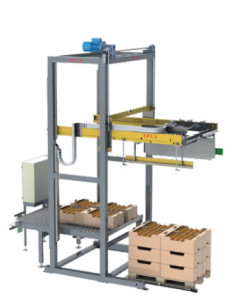 Paletizador de capas que traslada las mismas desde la mesa de formación de mosaico hasta el palet mediante unas mordazas vulcanizadas que presionan las cajas.