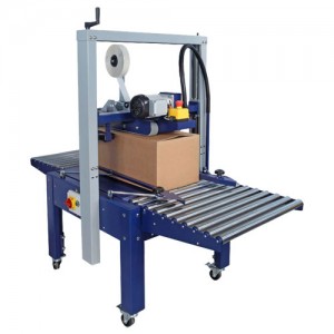 Máquina semiautomática para el cerrado de cajas con precinto. Formato de caja ajustable manualmente para trabajar con series largas de un mismo producto.