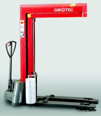 Envolvedora de brazo giratorio con batería, incorporada a una transpaleta manual.