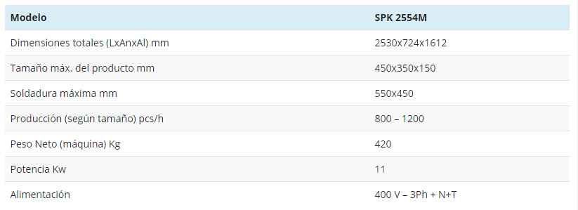Retractiladora SPK 2554M Monoblock, un sistema que incluye el conjunto soldador y túnel, es una solución flexible para retráctilar producciones bajas y medias de productos de las mas diversas categorías. No necesita complicados procesos de ajuste. La compacidad de la máquina y su fiabilidad la convierten en un producto idóneo.
