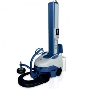 Máquina envolvedora semiautomática y semoviente para el embalaje de productos con film extensible en disposición vertical.