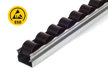 Roldana conductiva P=33 ESD. Rueda negra para el MINICARRIL, realizada de un compuesto plástico especialmente conductivo. Descarga totalmente de la electricidad estática auto-generada. Su coeficiente de resistencia al paso de la electricidad es de 28,8 Ω/cm², mientras que en el caso de la rueda negra normal (con carga de carbón) es de 5 x 10¹º Ω/cm².