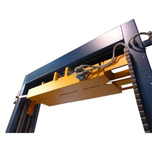Carro con rodillos motorizados mediante 2 motores independientes con porcentaje de pre-estiraje regulable desde cuadro desde 150% hasta 400%. Fuerza de sujeción sobre la carga controlada desde cuadro con dispositivo electrónico patentado. Dotado del sistema patentado QLS, para el enhebrado rápido del film.