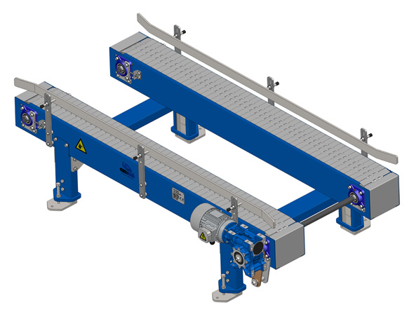 Transportador modular de cadenas de charnela de 2 vías, para el movimiento de pallets vacíos y con carga paletizada. Idóneo para cargas semi-pesadas e inestables. Avance de la carga de forma suave y continua. Amplias posibilidades de fabricación, tanto en accesorios como calidades.
