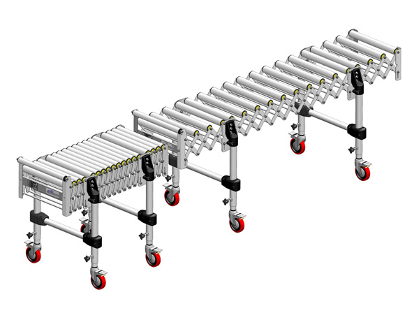 Transportador modular extensible de rodillos para manipulación de cajas y/o bandejas por gravedad. Totalmente configurable, se puede curvar, inclinar…, según la necesidad de trabajo. Ideal para preparación de packing, y conexionar al final de una precintadora.